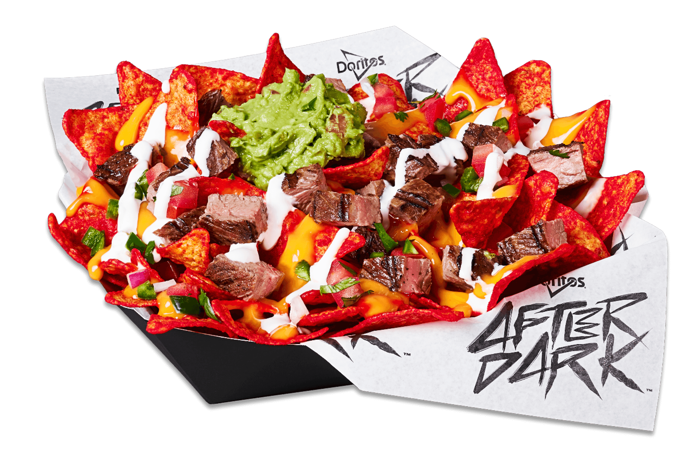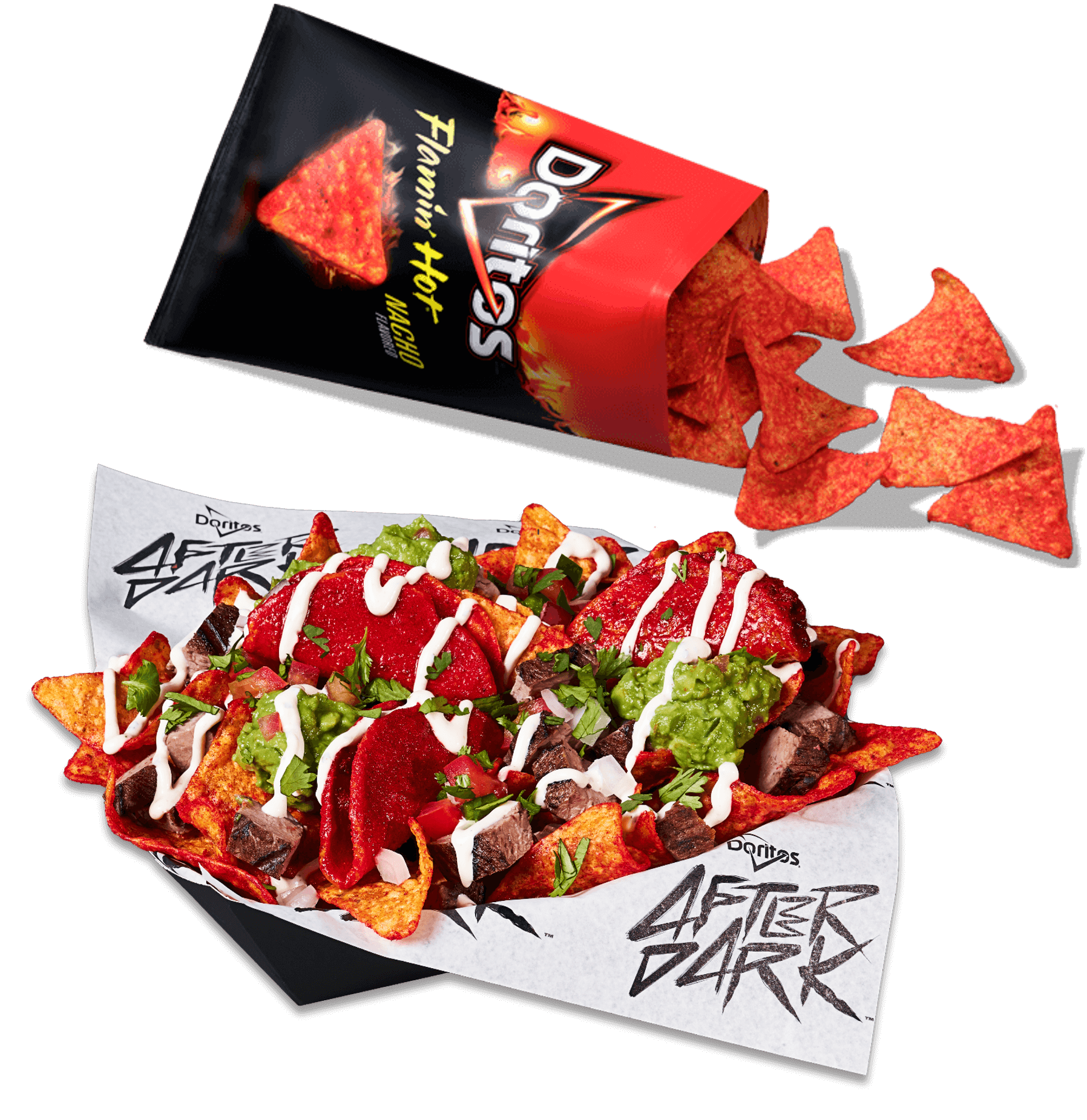 Choose your Doritos® base and pile on tender carne asada, lively pico de gallo, creamy guacamole, and gooey nacho cheese. A smooth Mexican crema finish cools the Flamin’ Hot® vibe for a craveworthy, late‑night nacho experience made to keep the crowd going.