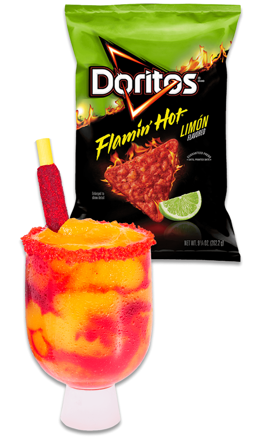 Taste a bold new act with this cool and refreshing frozen mango cocktail swirled with Doritos Flamin’ Hot Limón-infused chamoy and served with a tangy tamarind candy straw.